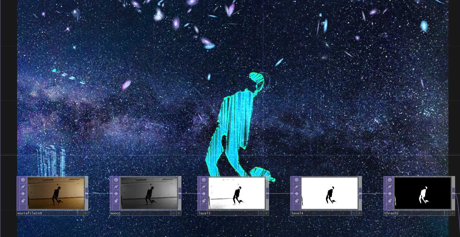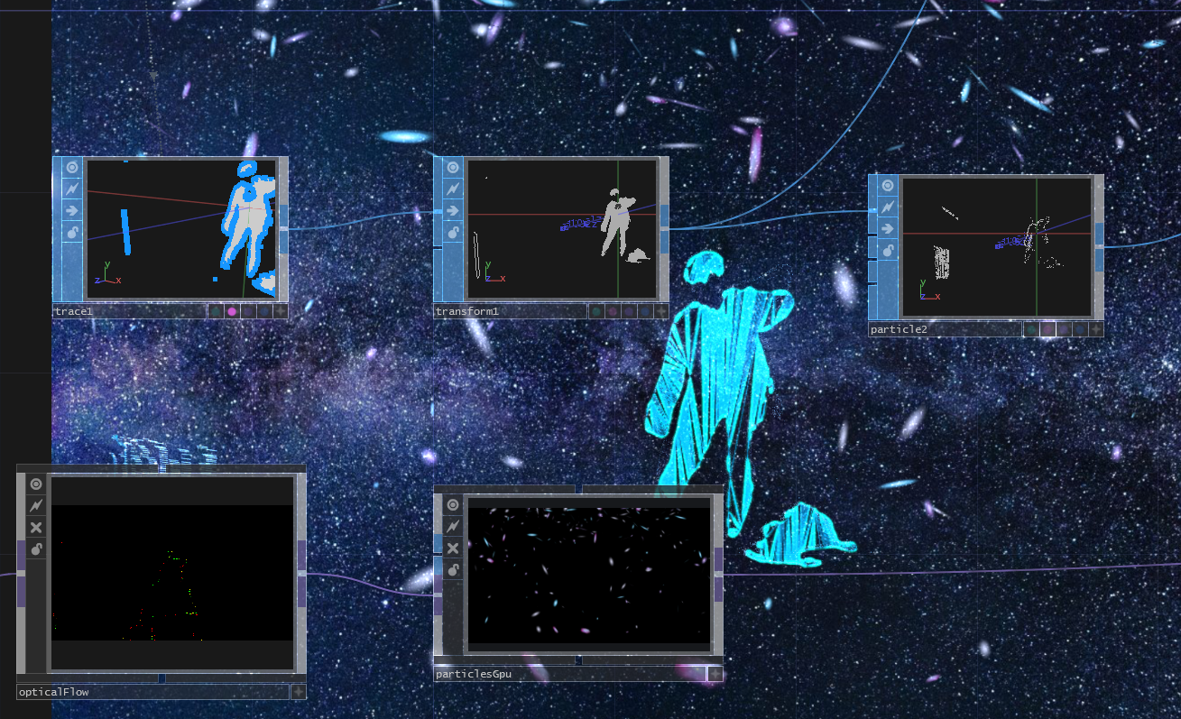 A conceptual installation exploring memory, embodiment, and transformation through video performance, interactive projections, and music using TouchDesigner and a Kinect. SCI 6338: Introduction To Computational Design Harvard Graduate School of Design, Fall 2021 Danny Clarke (MDes Publics '23) Laureen Andalib (MDes Publics '23)